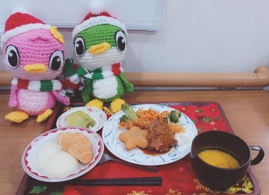 クリスマス会にちなんで、特別食は星型の形のポテトや、ツリー型のハンバーグや、パンプキンスープを提供いたしました。
