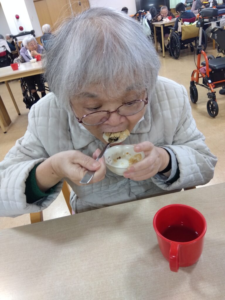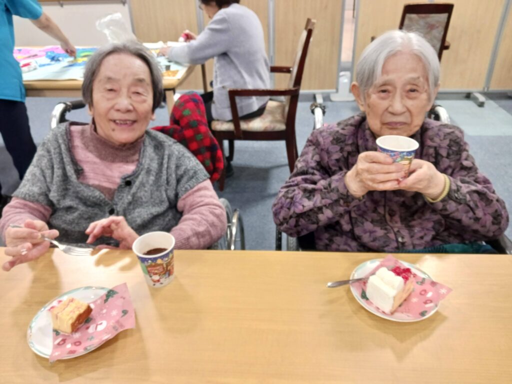 和やかなコンサートの後は、おやつの時間には、クリスマスケーキとミルクココア。利用者様に大変好評でした。
