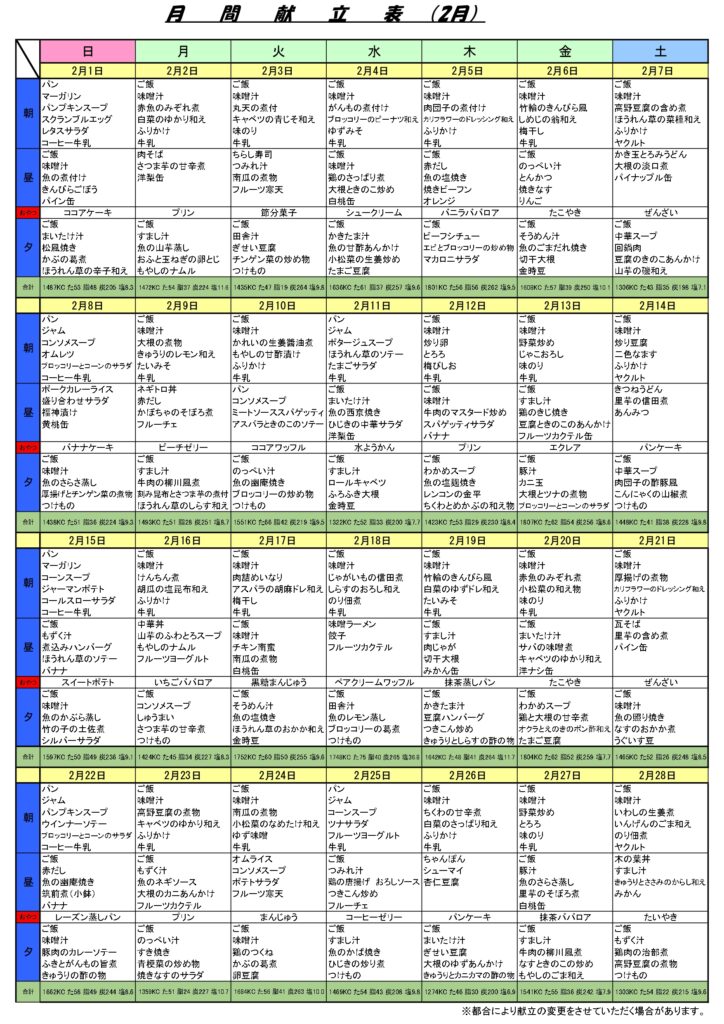 2月DSスケジュール&献立です。