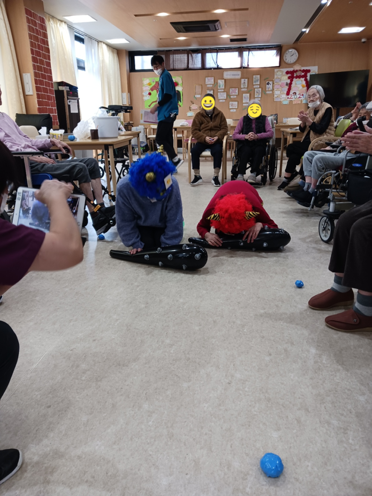 ということで、利用者さまと職員で豆……の代わりのボールで鬼退治(`・ω・´)