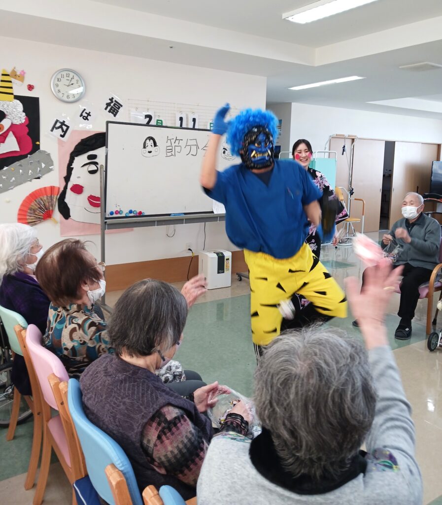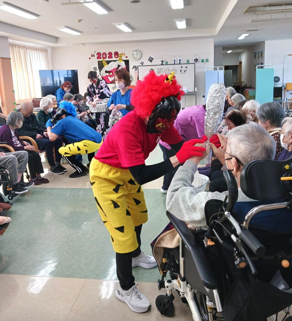 ケアライフ上白水【節分】 ケアライフ上白水ブログ 2026年02月11日 今日は節分でした👹 福の神様の後に、赤鬼と青鬼の登場です! 福の神様が見守る中、玉入れが始まりました(^^♪ 青鬼チーム赤鬼チームに分かれて対戦でした👹 赤鬼チームの勝利で今年の節分は終了しました。 とてもかわいらしい鬼のデコレーションムースを皆さん召し上がってました💛 外は寒いですが、デイサービスは熱気満タンでした!(^^)!