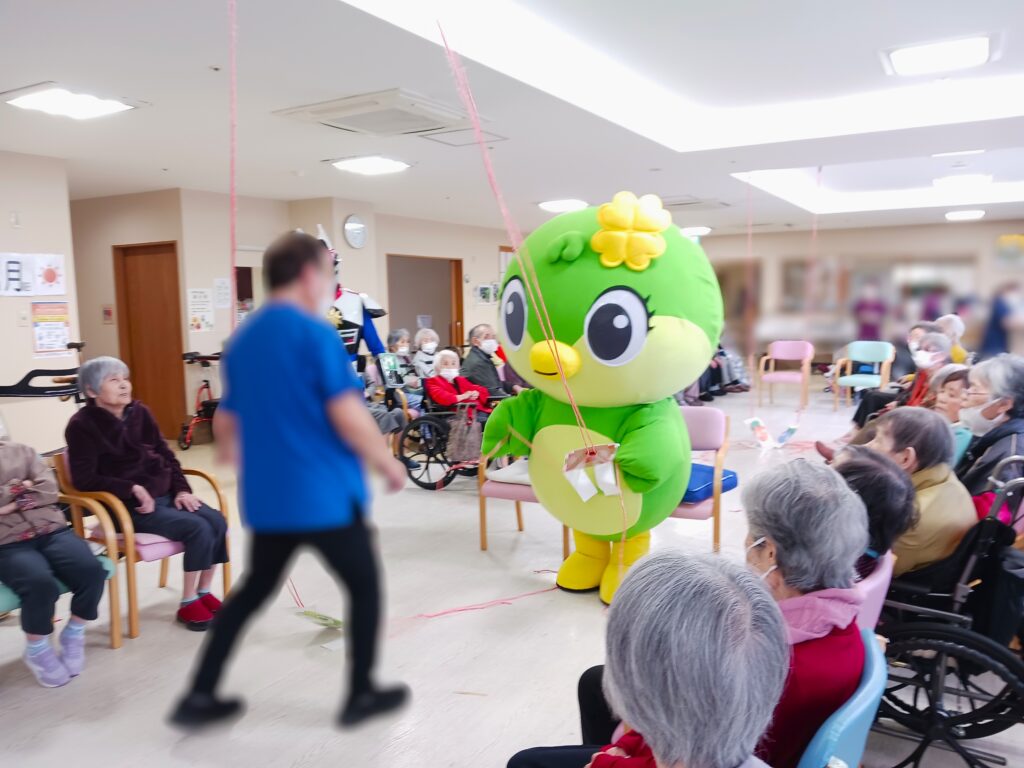 利用者様の手作り豆で豆まきをしていると、特別ゲストのベッティーちゃんが登場!