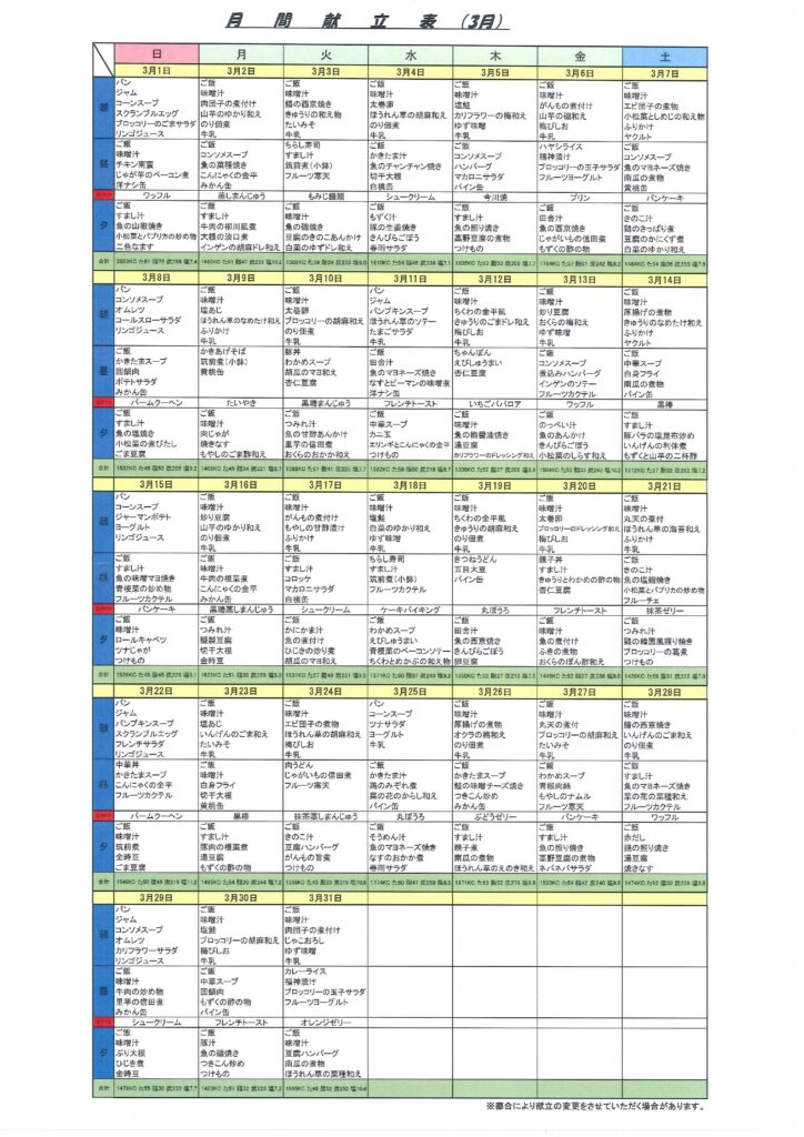 3月の献立表とレクリエーションスケジュールが出来ましたので、ご覧ください😊