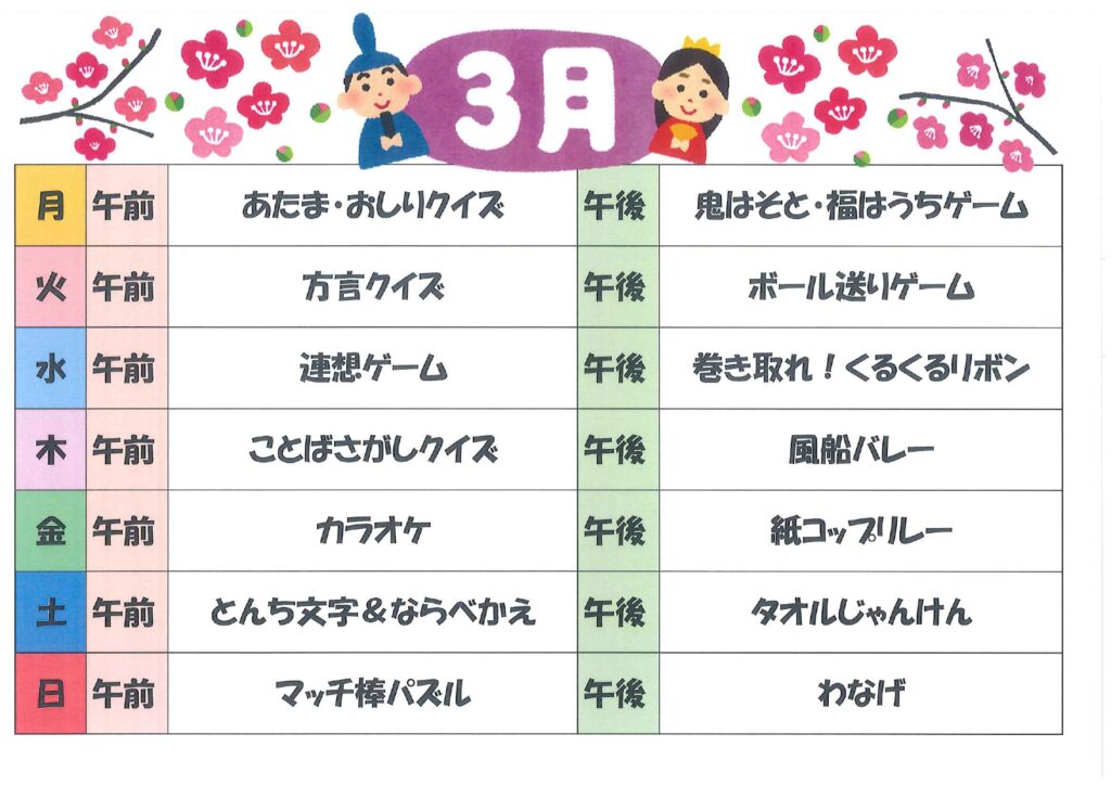 ケアライフ綾羅木 3月献立表&レクリエーションスケジュール🏃‍➡️🏃‍♂️‍➡️🏃‍♀️‍➡️