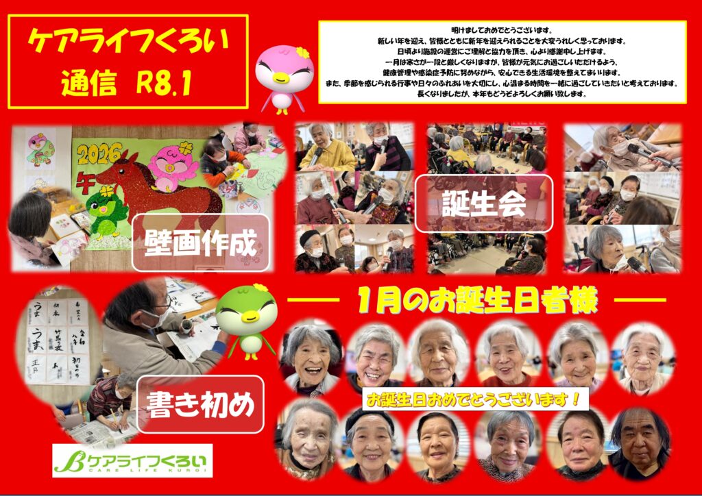 ケアライフくろい通信 令和8年1月号 ケアライフくろいブログ 2026年02月27日 こんにちは!ケアライフくろいです! 大変遅くなりました、今年最初のケアライフくろい通信です! 是非、目を通して下さい🤗 2025年はお世話になりました。 引き続き、2026年もどうぞよろしくお願い致します!