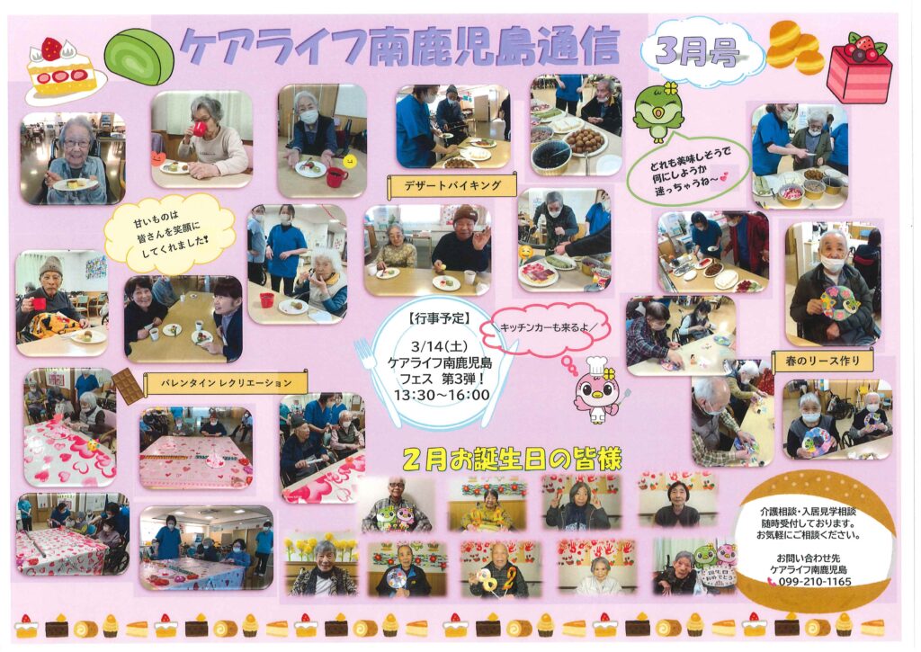 ケアライフ南鹿児島 施設新聞🎎3月号 ケアライフ南鹿児島弐番館ケアライフ南鹿児島 2026年03月17日 2月のデザートバイキングのご様子、 制作活動など掲載しております。 是非、ご覧下さい( *´艸`)