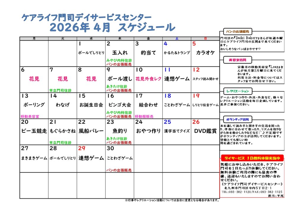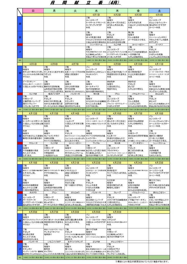 ケアライフ門司 4月DSスケジュール&献立