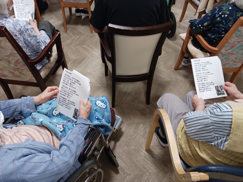 歌詞カードを見ながら、皆さんで何曲も合唱しました。声を出して歌うと気分がスッキリしますね。