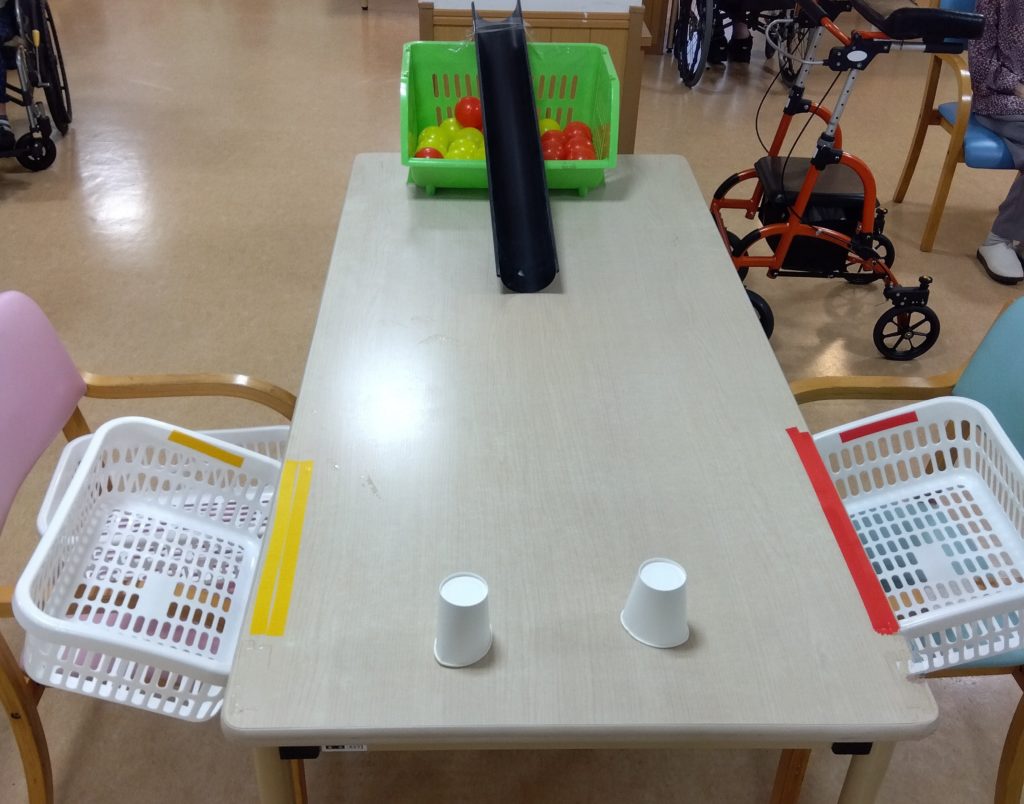 職員がランダムに流したボールを紙コップを使ってそれぞれのカゴに入れていきます!