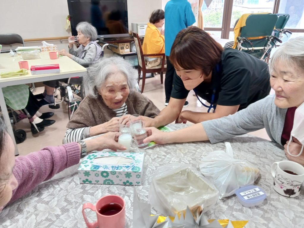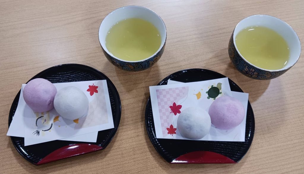 イベントを楽しんだ後は、高級茶と紅白饅頭。楽しい敬老会となりました。