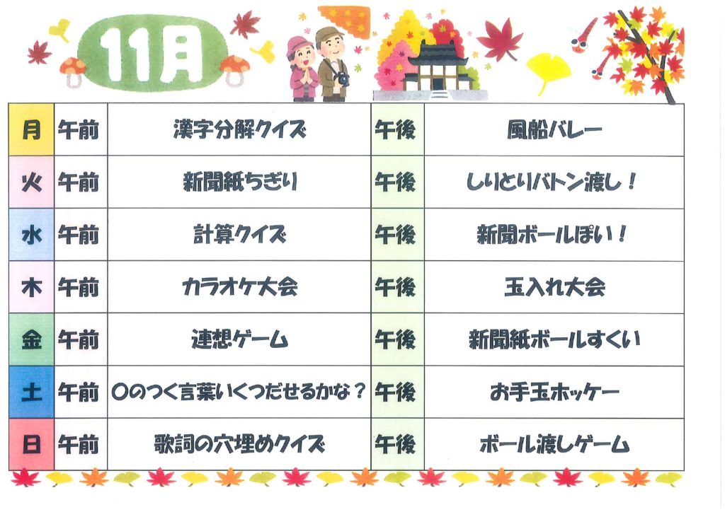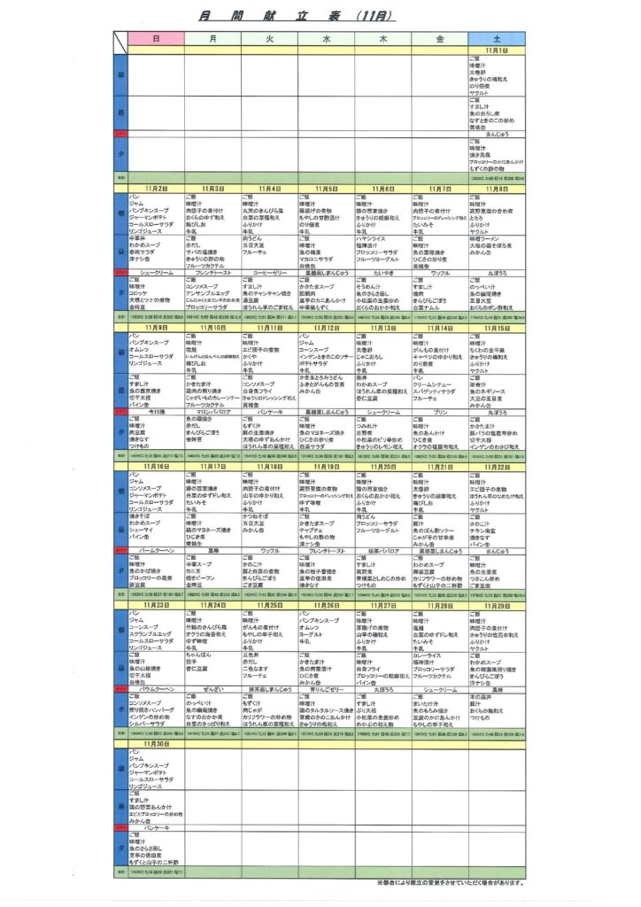 11月の献立表とレクリエーションスケジュールが出来ましたので、どうぞご覧ください。
