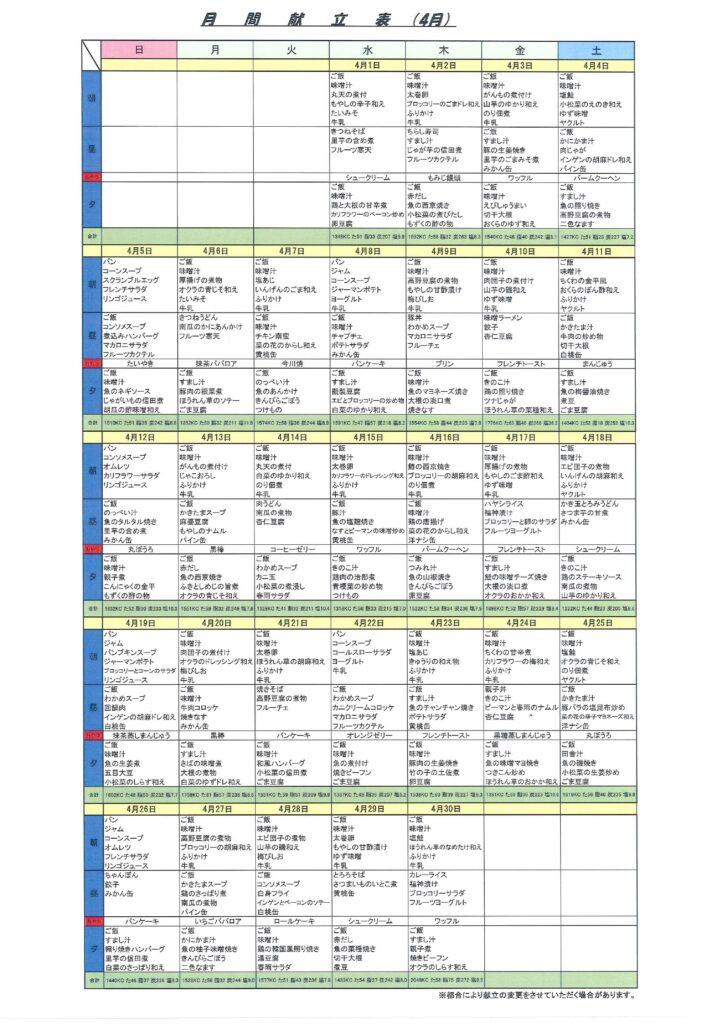 4月の献立表も掲載しております🍴