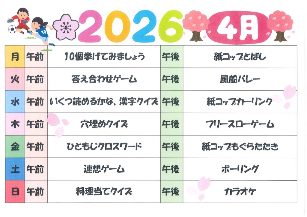 4月の献立表とレクリエーションのスケジュール表ができましたので、是非ご覧ください🐤
