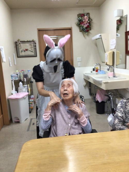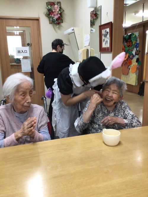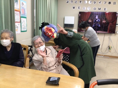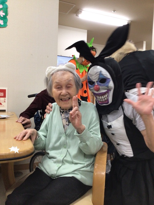スタッフが仮装して登場し、ご利用者様の近くに行くと笑顔で楽しそうに怖がるふりをされていました。
