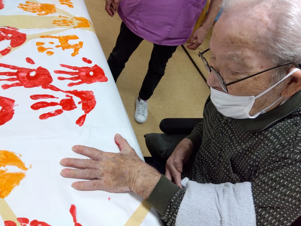 両手いっぱいに紅葉色の赤・オレンジの絵具を塗ります!