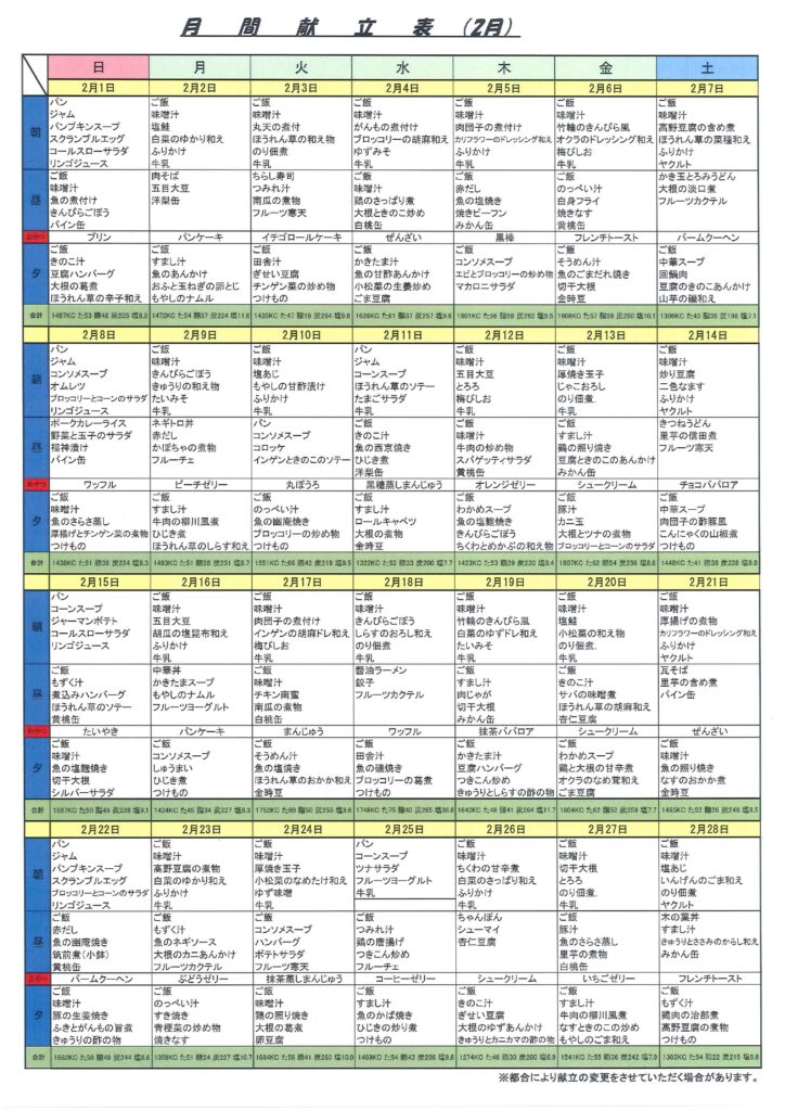 2月の献立表が出来ましたので、ご覧ください🤗