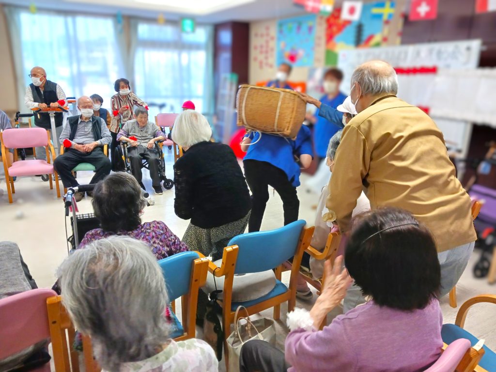 玉入れでは、スタッフさんが背負ったカゴめがけて玉を投げ入れました。
