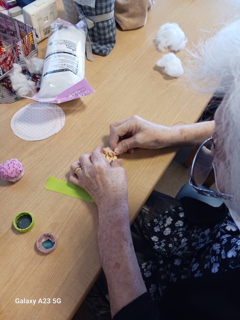 3.ペットボトルの蓋に作った綿をボンドで貼り付けます