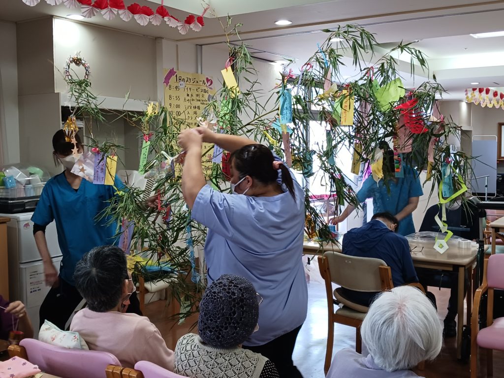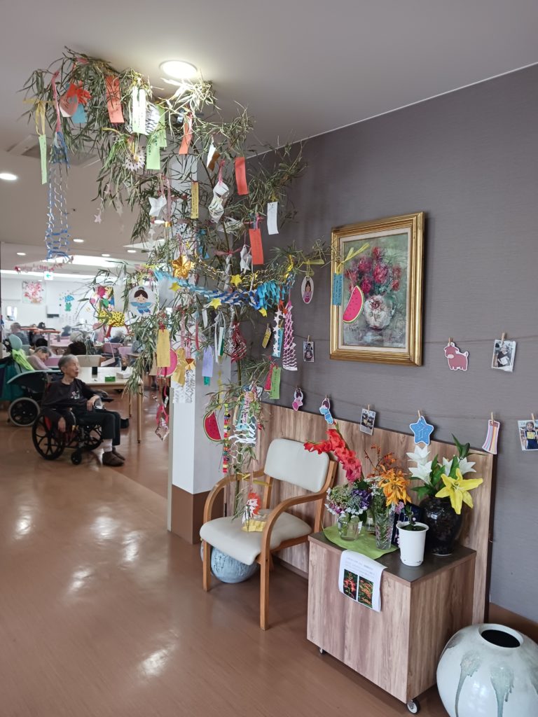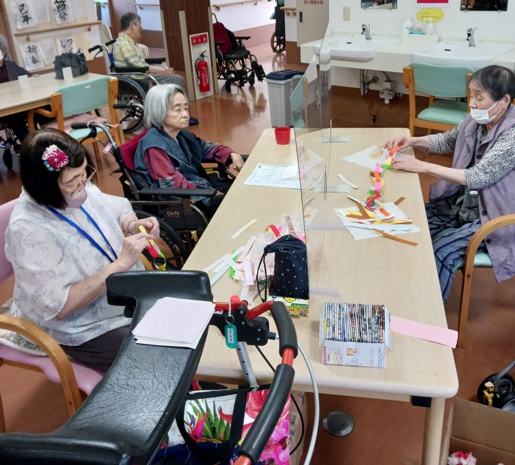 短冊にお願い事を書き、色とりどりの飾りを作って、笹につけました。