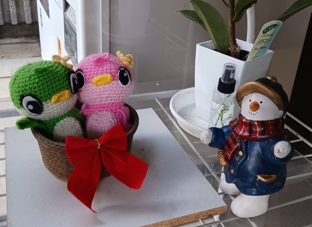 午年にちなんで職員が可愛い白馬のぬいぐるみとみかんを編んでくれました。