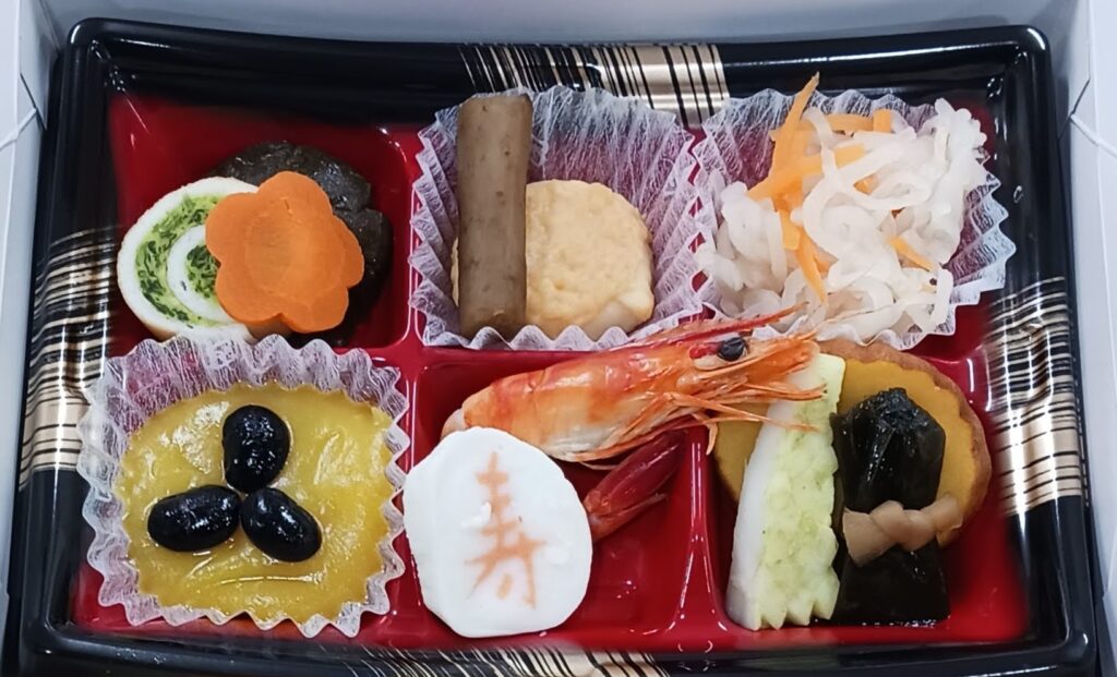 ケアライフ船橋の特製おせちは、ご長寿を願って海老がセンターです。