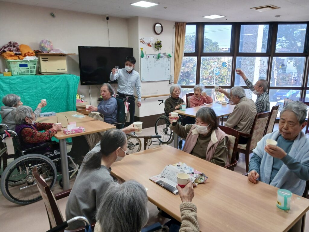 毎年恒例の元日行事、まずは各階の入居者の方達と施設長のカンパーイ!