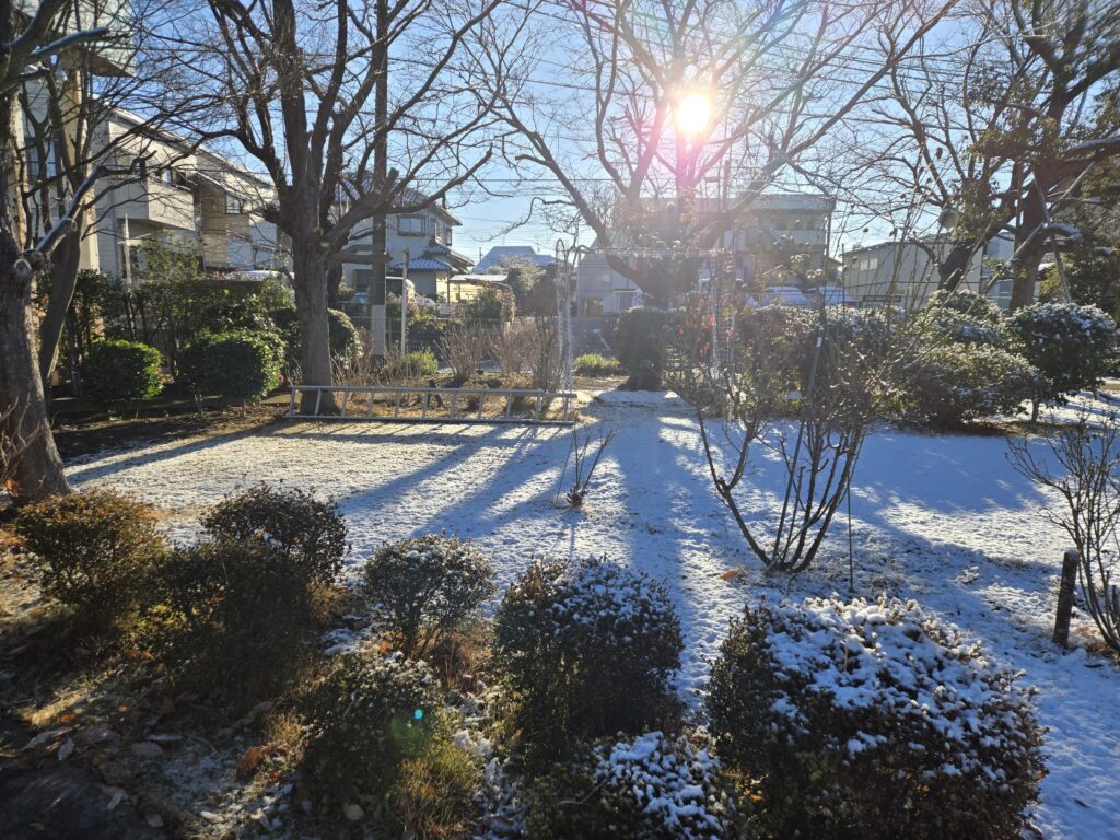 新年早々雪が降り、施設庭園がきれいに雪化粧!大雪にならずにホッとしました。