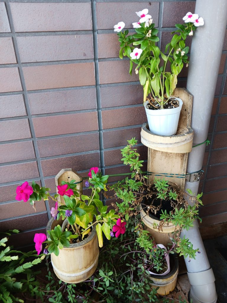 玄関には竹のプランターに季節のお花を植えて(^_-)-☆