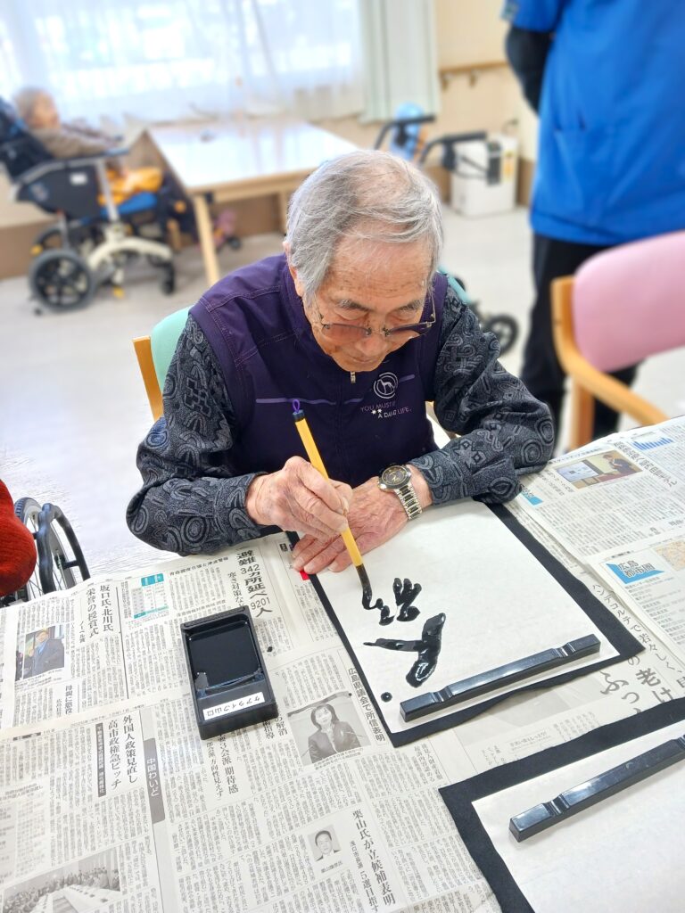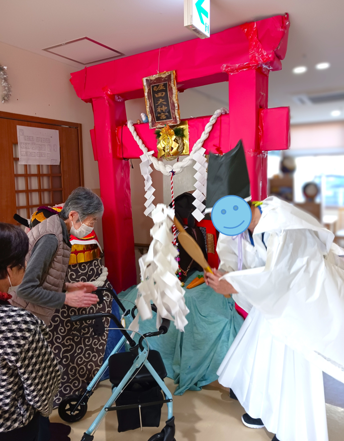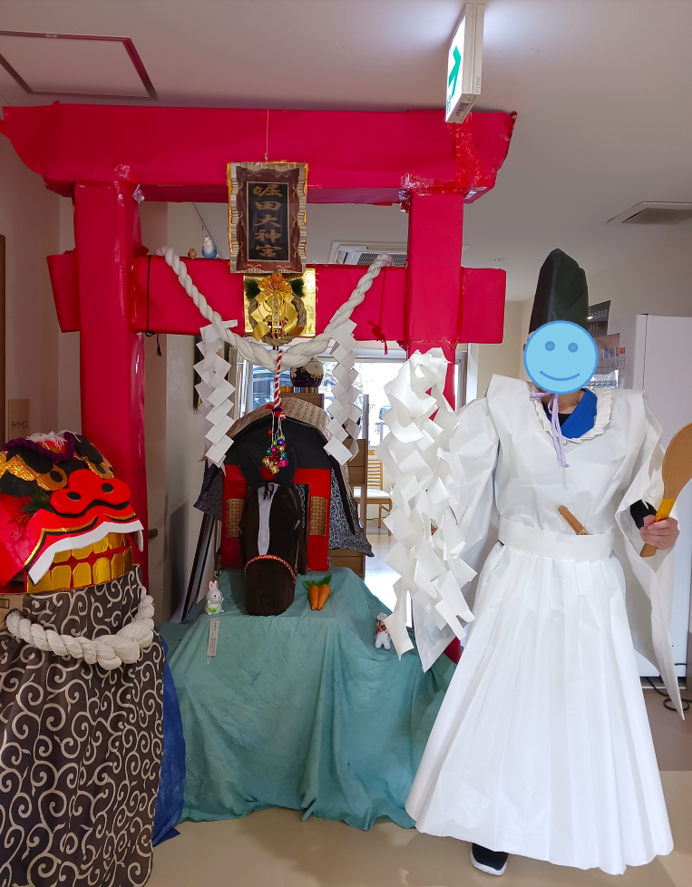 新しい1年の始まり、デイルームの前には毎年新年に現れるケアライフ山口神社の大鳥居が!